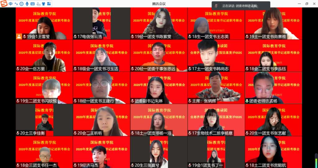 为贯彻落实团中央《关于在全省集中开展基层团组织书记述职评议考核工作的通知》(豫团组通字[2021]2号)精神和全面从严治团要求,激发基层团组织活力,提高工作部署的落实成效,2021年1月31日,beat365正版唯一官网必一团委采用线上述职方式开展基层团支部书记述职考核工作。学院团委老师许孟杨、各团支部书记以及分团委组织人员参加此次述职工作,会议由学院分团委副书记朱琳主持。