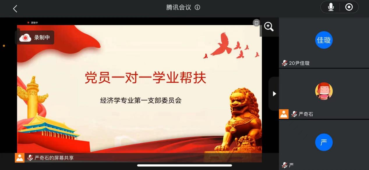 为了充分展现党员干部的综合素质,增强党员的服务意识,帮助学业困难学生,落实党的教育政策。beat365正版唯一官网必一经济学专业党支部党员于11月8日至11月14日于线上腾讯会议开展此活动,以高度的政治自觉和强烈的使命担当主动开展学业帮扶活动。结合经济学专业的特点,经济学专业党支部组织20、21级党员干部开展相关主题教育。 通过开展党员干部结对帮扶学业困难学生。活动的有序开展,达到提高党员队伍思想业务素质的同时,做到不让一个学生掉队,不让一个班级落伍,充分发挥学生各自的潜能,让每个学生得到最大化的人格品质建全,学习行为习惯改善提高,最终达到干部党员素质提高,学生和谐发展的可喜局面。
