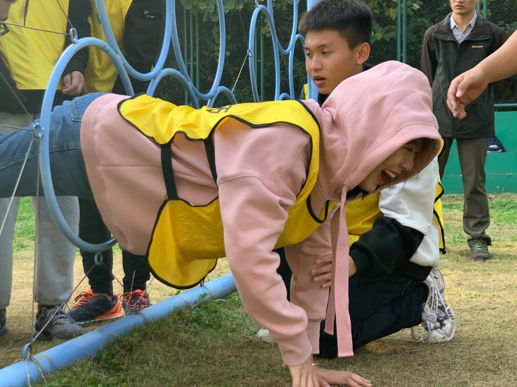活动伊始,三位老师将队伍分成绿、黄、蓝三组,随后分别向同学们介绍游戏规则和注意事项。在负责老师的带领下,学生依次完成了“模拟电网”、“礼让通行”、“合力制胜”、“毕业墙”、“高空断桥”等项目。游戏过程充满了欢声笑语,每位学生全情投入,群策群力,充分发挥团队协作精神,积极参与其中。