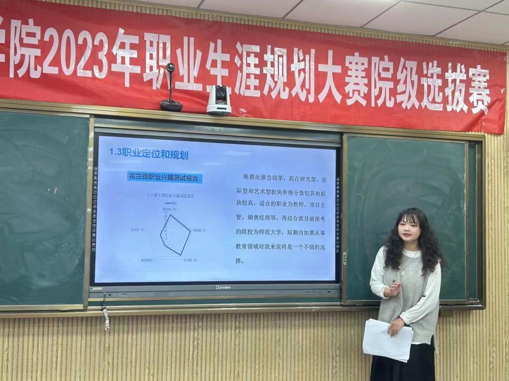 参赛选手现场结合PPT进行演讲,介绍了对个人、职业的探索和职业目标的选择及规划,讲述了在实现职业目标中已实施的具体行动和成果,思路清晰,目标明确,准备充分,为观众做出了良好的示范。本次参赛的作品多以教师、会计、管理等为职业对象,结合自己专业和兴趣进行论述,展现了学生对自己职业规划能力和就业能力的理解,并进一步提出未来发展方向,为实现今后创业就业打下坚实的基础。