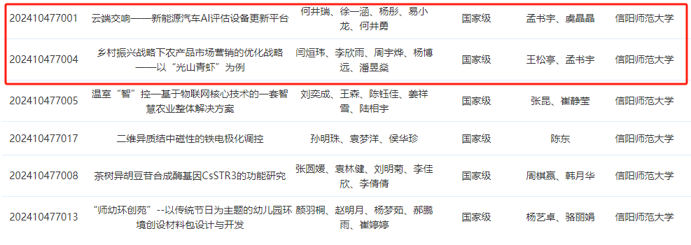 近日,河南省教育厅发布《关于公布2024年国家级大学生创新训练计划项目名单和结题验收结果的通知》(教高司函〔2024〕13号),公布了2024年度国家级大学生创新创业训练计划项目名单。经高校申报、专家评审和教育部审定,2024年河南省本科高校共获批国家级大学生创新训练计划重点支持项目15项,国家级大学生创新训练计划项目744项。信阳师范大学获批国家级大学生创新训练计划重点支持项目1项,国家级大学生创新训练计划项目5项,共计6项,其中beat365官网2022级经济学1班何井瑞主持的《云端交响--新能源汽车AI评估设备更新平台》获批国家级大学生创新训练计划重点支持项目,2023级经济学2班闫烜玮主持的《乡村振兴战略下农产品市场营销的优化战略——以“光山青虾”为例》获批国家级大学生创新训练计划项目。