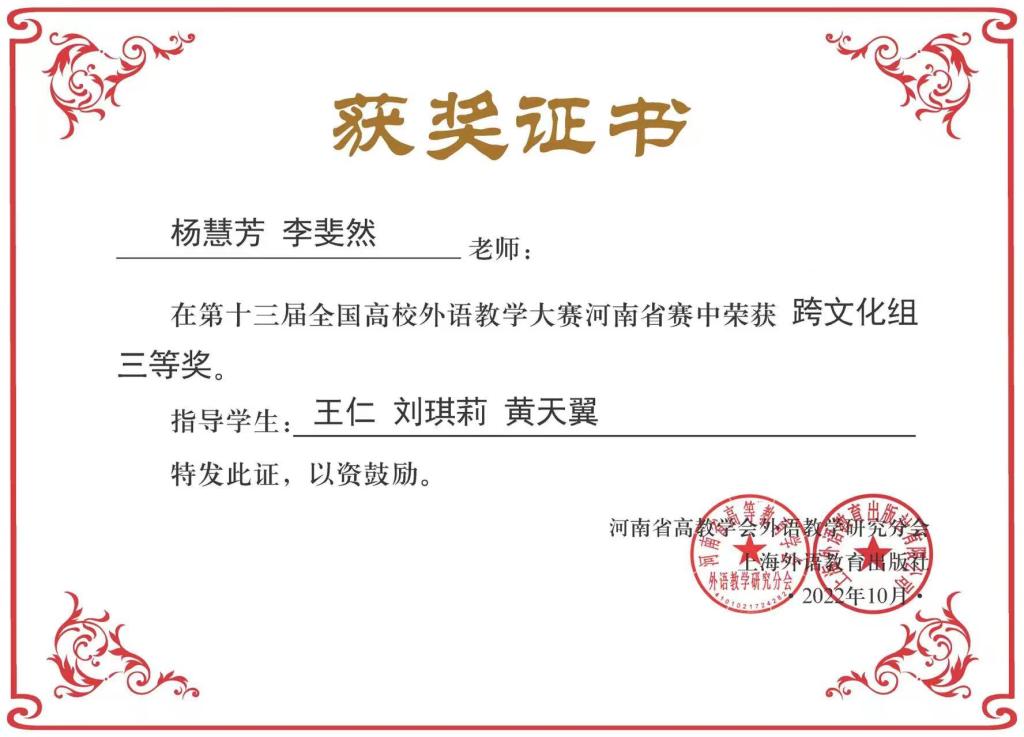 第十三届全国高校外语教学大赛河南省赛在郑州胜利闭幕,由beat365官网英语教研室主任李斐然担任指导教师,2020级会计学1班学生刘琪莉,2019级会计学2班学生黄天翼组成的参赛队伍经过案例表演、评委问答、组委会终评等环节,从全省50余所本科院校103名选手中脱颖而出,斩获“跨文化组”三等奖。