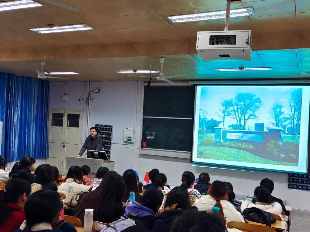 方晓波、俞彤辉教授分享了各自在美国米勒斯维尔大学的访学和生活经历。方晓波介绍了美国米勒斯维尔大学的课程设置、教学模式、成绩评价模式等。俞彤辉就如何适应美国大学生活做了精彩分享。他们充实有趣的访学生活,幽默风趣的讲解风格赢得同学们掌声不断、笑声连连,进一步激发了学生们对美国留学生活的兴趣。