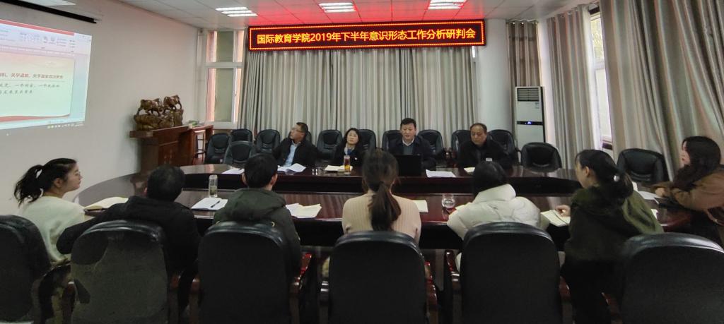 为深入贯彻落实意识形态工作责任制,把意识形态工作各项任务落到实处,1217日下午,国际教育学院在逸夫楼302会议室召开2019年半年意识形态工作分析研判。学院领导班子成员,科级干部以及辅导员班主任参加。会议由姚新春主持。