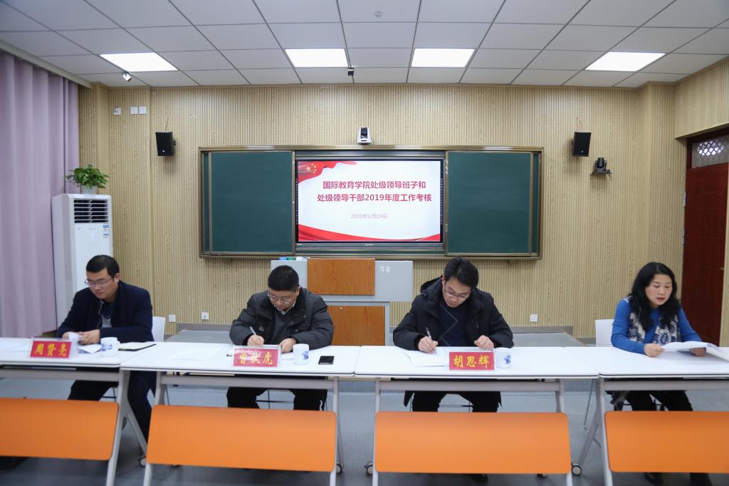 12月24日下午,国际教育学2019年度处级领导班子和处级领导干部考核工作会在逸夫楼201教室召开。校第二考核组组长、校党委委员、党委统战部部长曾伏虎考核组成员、校纪委办公室副主任胡思辉校党委组织部干部科科长周贤亮出席指导考核工作会。学院全体教职工参加。会议由学院党委书记张震主持。