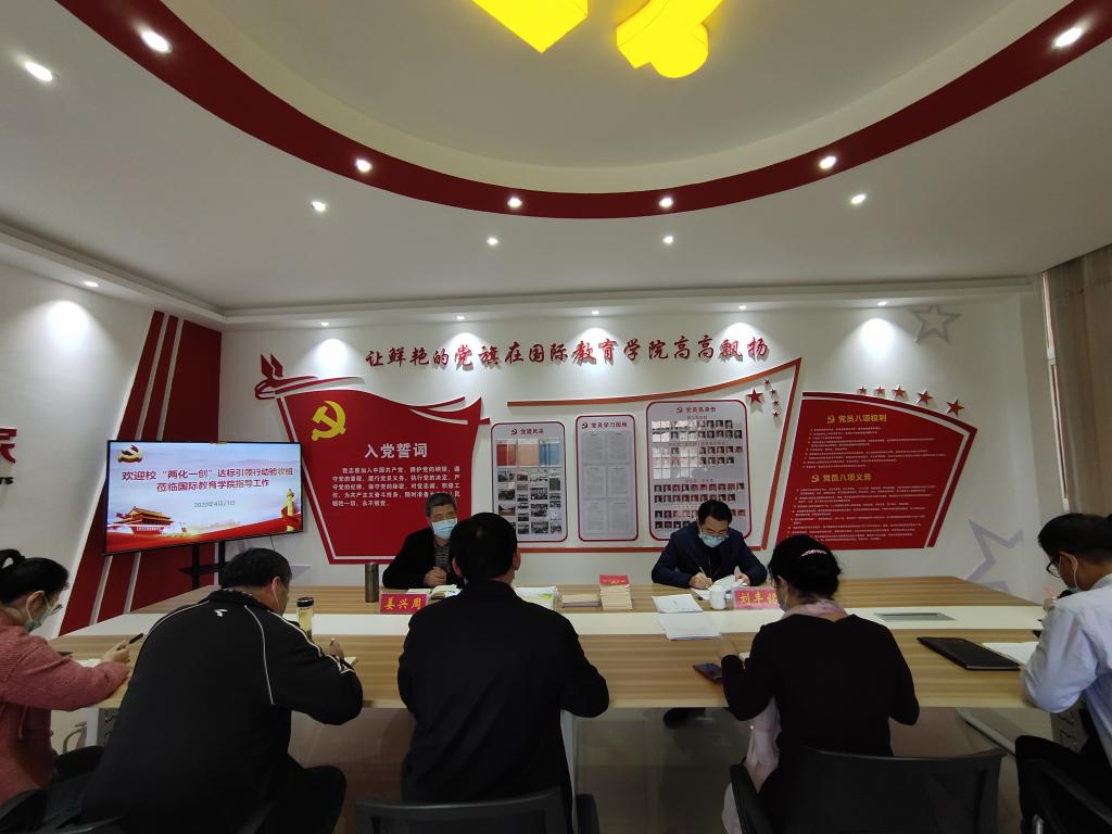4月21日下午,校“两化一创”达标引领行动验收工作第三验收组组长姜兴周成员刘丰铭莅临国际教育学院检查指导工作。学院党委书记张震、院长李保红,党委副书记姚新春以及各支部书记参加。会议由张震主持。